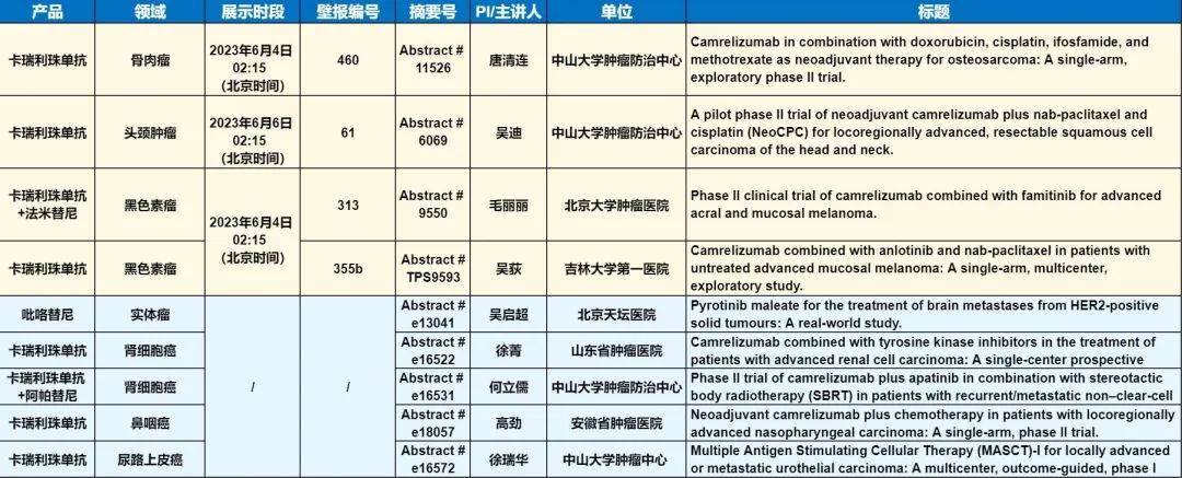 此外,在头颈肿瘤、黑色素瘤、骨肉瘤、鼻咽癌、肾细胞癌、尿路上皮癌等多个领域,卡瑞利珠单抗、吡咯替尼等产品相关研究一共入选了4项壁报展示和5项线上发表,彰显了金年会医药强大的自主研发综合实力。