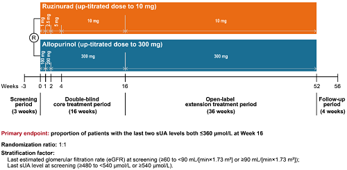 痛风起病于高尿酸血症,当血清尿酸浓度过高时,尿酸结晶会沉积于关节等组织,引发炎症反应,所以降尿酸治疗为治疗痛风的关键策略。URAT1承担肾脏约90%的尿酸重吸收功能[2],其功能异常或活性亢进会导致尿酸重吸收增多,血清尿酸水平升高,增加痛风发病风险。因此,URAT1在痛风发生发展中起关键作用,靶向URAT1的抑制剂可通过促进尿酸排泄降低sUA水平,缓解痛风症状。鲁兹诺雷钠片是金年会医药自主研发的一种高选择性URAT1抑制剂,在前期的一期、二期研究中,鲁兹诺雷钠片耐受性良好,并显示出显著降低高尿酸血症患者sUA的效果[3]。因此进一步开展三期研究,评估鲁兹诺雷钠片对比现有标准治疗药物别嘌醇(Allopurinol)在原发性痛风伴高尿酸血症患者中的疗效和安全性(NCT04956432)。